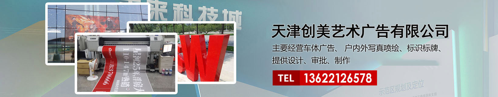 天津創(chuàng)美藝術廣告有限公司主要經(jīng)營車體廣告、 戶內外寫真噴繪、標識標牌、提供設計、審批、制作、發(fā)布的服務。